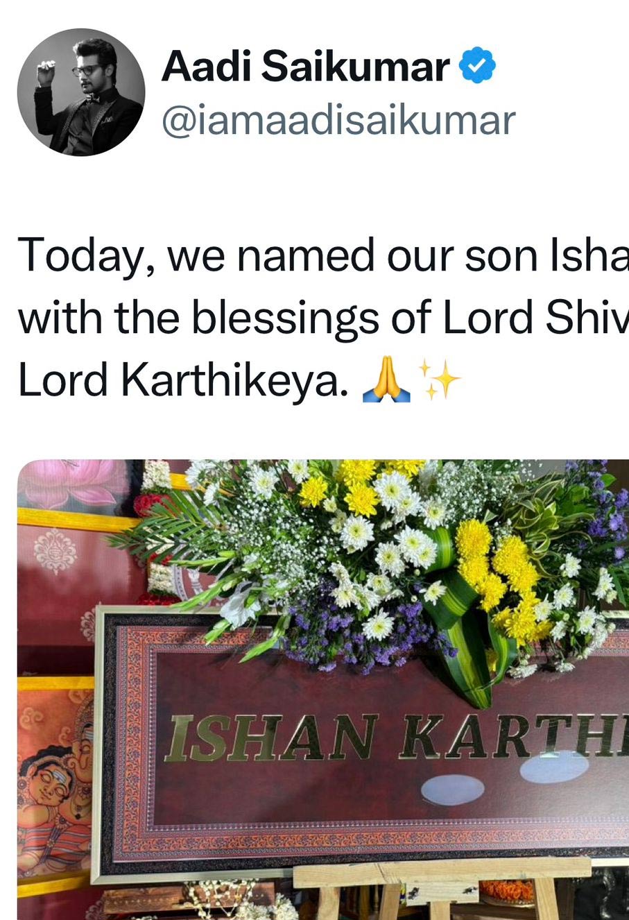 They had been blessed with a daughter whom they named as Aayana and on January this 12 months, they had been blessed with a cute son. As we speak they shared the identify of their son. Aadi posted “As we speak, we named our son Ishan Karthik, with the blessings of Lord Shiva and Lord Karthikeya”