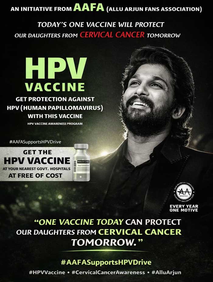 Allu Arjun Followers Affiliation (AAFA) takes the initiative to advertise HPV vaccination drive. Allu Arjun has great fan following amongst all sections of individuals. His fan following elevated in leaps and bounds internationally following the feeling of Pushpa franchise.