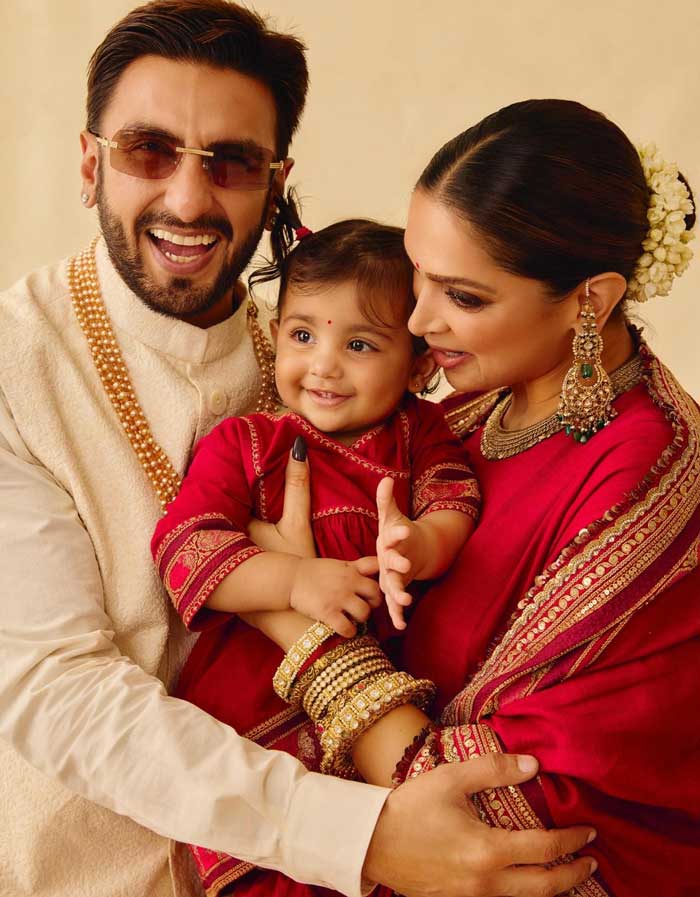 Within the photographs, the couple may be seen wearing coordinated festive outfits. Deepika wore a surprising crimson silk salwar kameez with heavy conventional gold jewelry, whereas Ranveer exuded his trademark attraction in an ivory sherwani paired with a layered pearl necklace and sun shades. Dua, wearing an identical crimson outfit, appeared cute in her mother and father’ arms, along with her cute little ponytails making the image all of the extra cute.