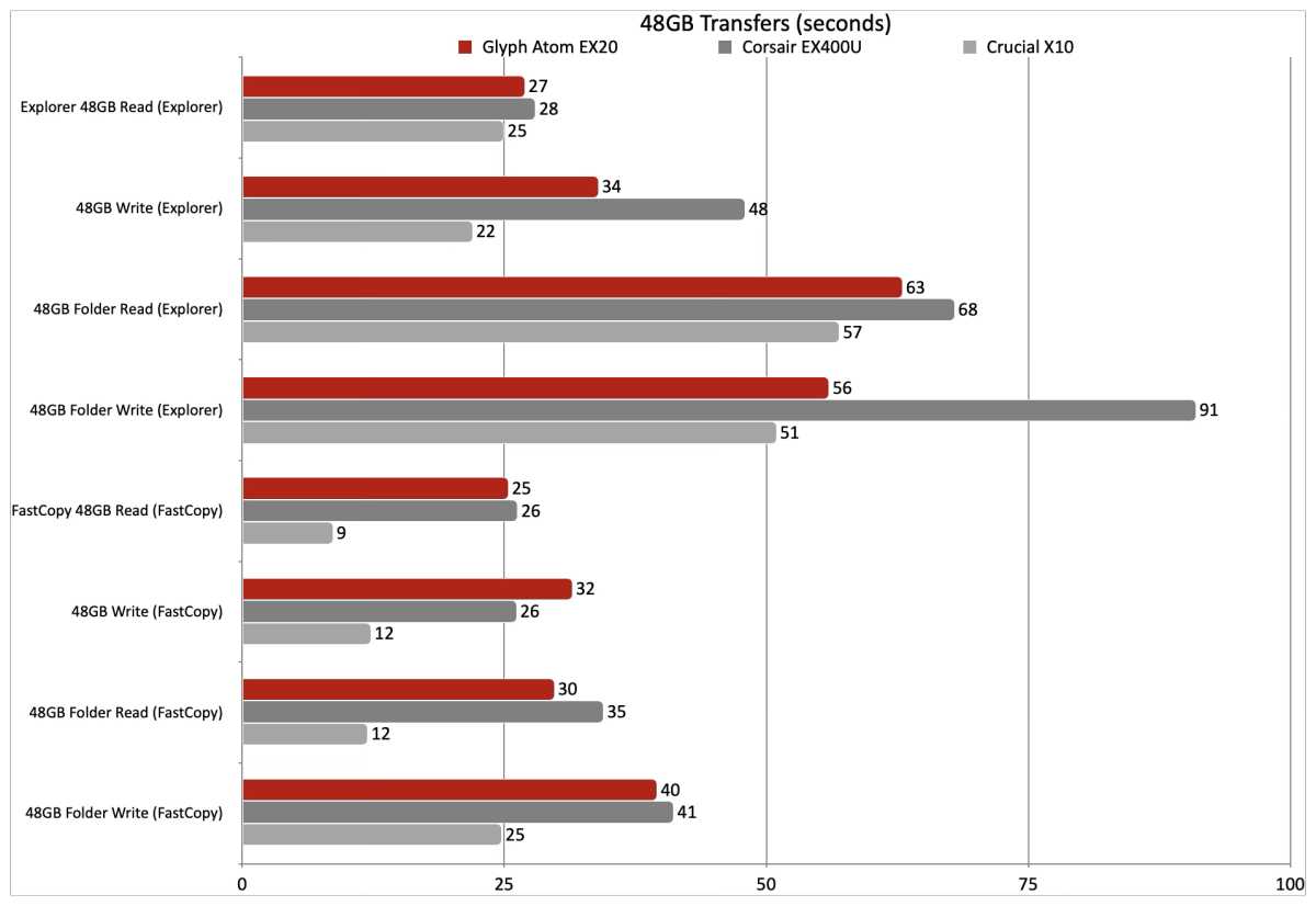 The Atom EX20 was aggressive in our real-world 48GB transfers, although it didn’t present as a lot potential within the FastCopy exams because the Essential X10.