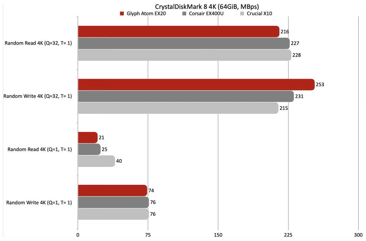 The Glyph Atom EX20 once more competed properly with its rivals (Corsair EX400U, Essential X10) within the CrystalDiskMark 4K exams.