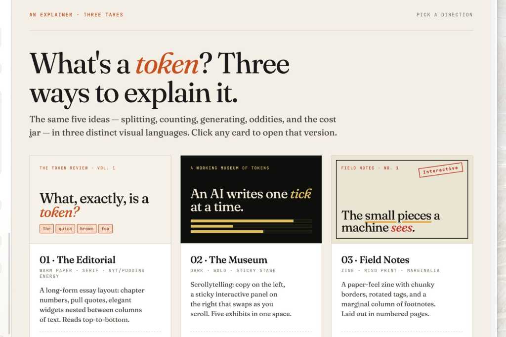 Inside 5 minutes, Claude Design had created a draft for me–a handsome-looking webpage that takes you thru AI tokens step-by-step, together with interactive sections the place you’ll be able to sort in phrases and watch the token depend in actual time. The copy was clear, pleasant, snappy, and–so far as I may inform–correct. It was just about simply what I needed, all within the first shot.