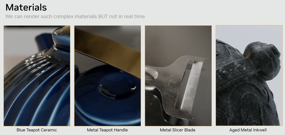 Nvidia confirmed off two demonstrations: neural texture compression and neural supplies. Nvidia demonstrated how NTC might be used to compress a scene that beforehand required 6.5GB of VRAM to only 970 MB with NTC. It’s not as clear what Nvidia is doing with neural supplies, nevertheless it seems the corporate is attempting to inform the GPU what the properties of a fabric truly are, after which compress these directions. The graphics card would then primarily assemble the fabric, rushing up the method from between 1.4X to 7.7X, in line with Nvidia.