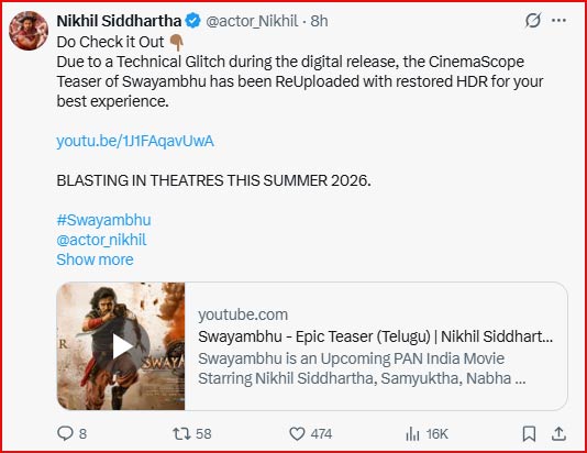 He posted “Youtube 😖enduku bhayya ila Glitch u did..Watch the ReUploaded Teasr of #Swayambhu now on Ps- No AI has been utilized in our movie in contrast to different not too long ago Launched.”