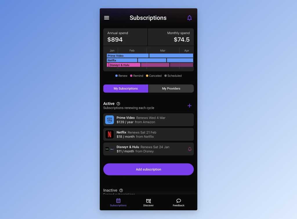 StreamWolf gives an summary of all of your streaming subscriptions, reveals you the overall value, and allows you to cancel (or reactivate) particular person providers with only a button faucet. It additionally affords some watchlist options so you may plan what to pay for at any given time.