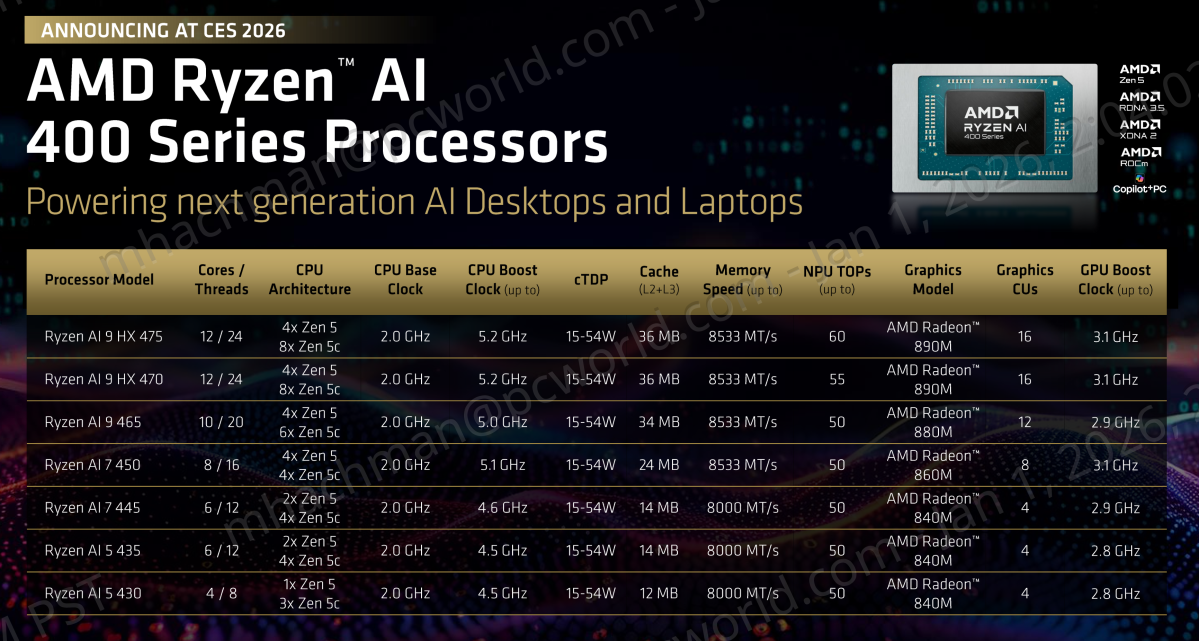 AMD launched seven Ryzen AI 400 chips at CES 2026, together with a pair of HX processors on the prime finish. It’s not clear whether or not they’ll all be accessible on the desktop.